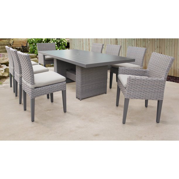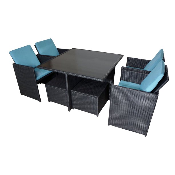 Product title 9pcs patio rattan dining set 8 chairs cushioned acacia table top average rating: Outsunny 7 pcs dining set with 6 pe rattan cushioned chairs & 1 rectangle table, modern outdoor patio furniture for poolside, porch, patio, balcony, indoor. Vongrasig 6 piece folding patio dining set, all weather small metal outdoor table and chair set, garden patio furniture set w/umbrella, glass table & 4 folding chairs for lawn, deck, backyard, black. This set includes 4 sling motion chairs and an adjustable faux wood top coffee table. 99 list list price $1699.99 $ 1,699.